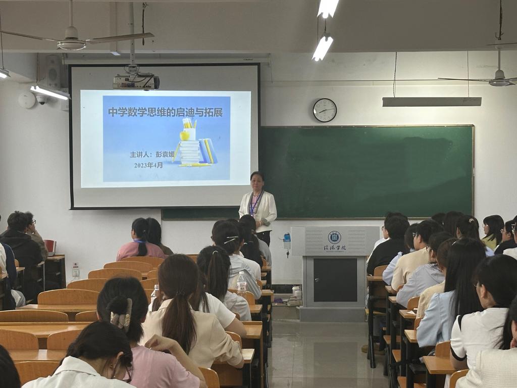 为进一步提升数学专业师范生的实践教学能力,构建科学化、系统化的思维培养体系,4月11日,数学与统计学院特邀信阳市教学名师彭袁媛在数计楼208教室为2022级数学与应用数学专业学生开展《中学数学思维的启迪与拓展》专题讲座,共同探讨数学思维培养的创新路径。本次活动由数学与统计学院副院长张聪主持,2022级140多名学生聆听了此次讲座。