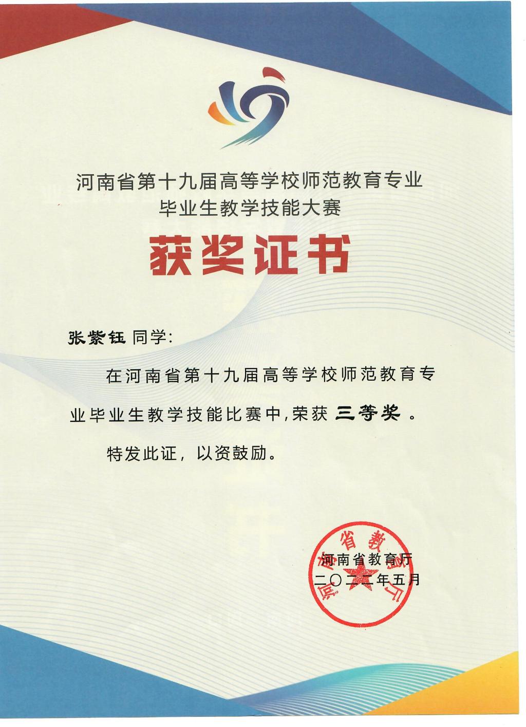 张紫钰-河南省第十九届高等学校师范教育专业毕业生教学技能比赛三等奖
