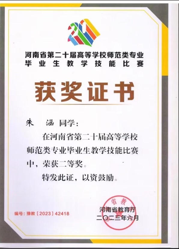 朱涵—河南省第二十届高等学校师范类专业毕业生教学技能比赛二等奖