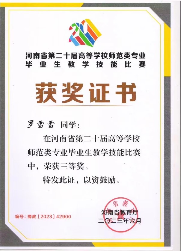 罗雪雪—河南省第二十届高等学校师范类专业毕业生教学技能比赛三等奖