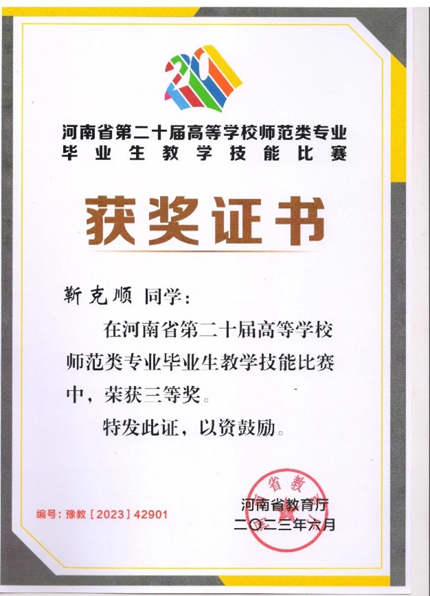 靳克顺—河南省第二十届高等学校师范类专业毕业生教学技能比赛三等奖